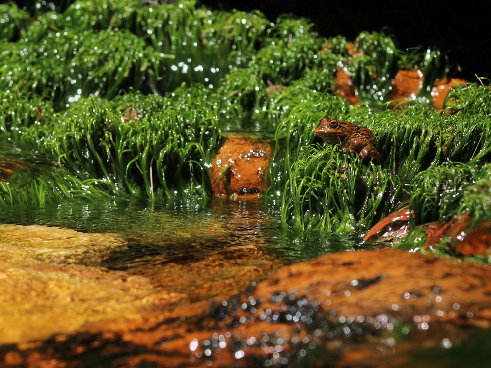 An ordinary mountain stream frog sits atop a water grass at the foot of a waterfall, while water droplets scattered across the rocks and grass reflect beautiful pinpoints of light.