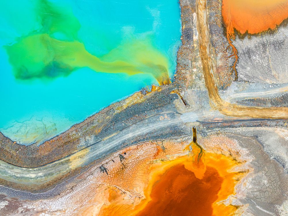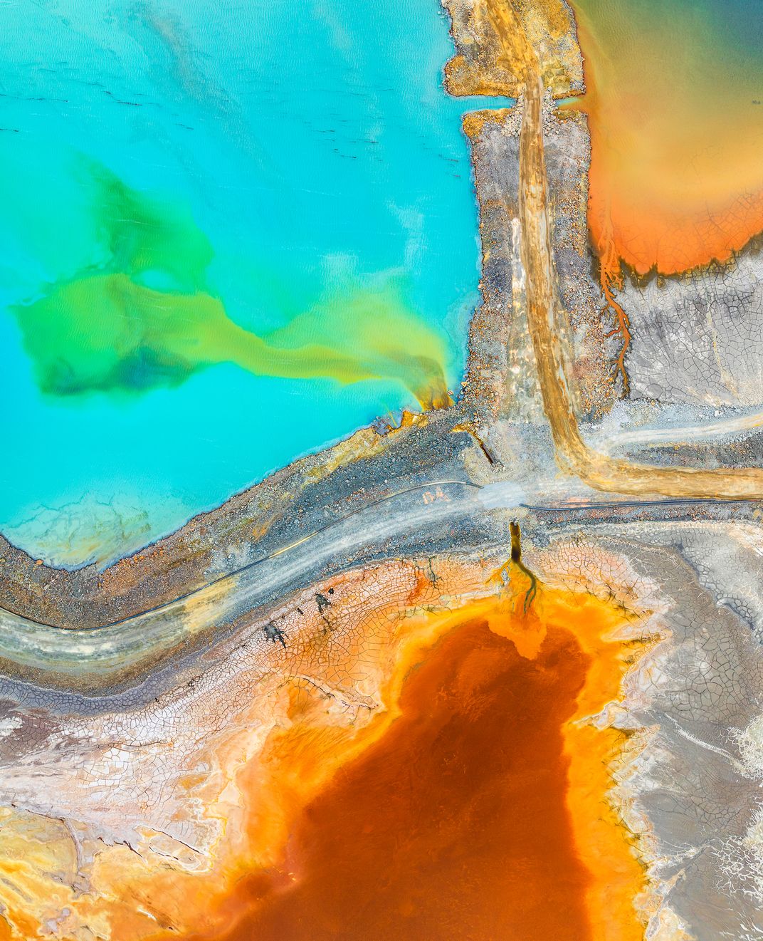 Remnants of copper mining linger in tailing ponds where minerals have settled into vivid layers of turquoise, rust, and ochre. From above, these colorful deposits form striking yet unsettling abstract patterns. They mark the intersection of natural chemistry and industrial extraction. It’s a landscape where beauty and environmental cost are inextricably linked.