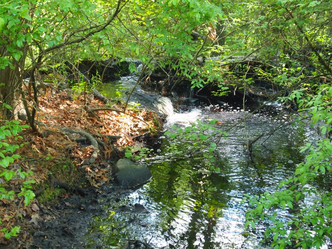 Over the years beavers have made an interior and exterior dam in a pond residing on conservation land. The dam has changed the landscape of the pond and put previously dry land and trees under water. It has also created a small waterfall pictured here.