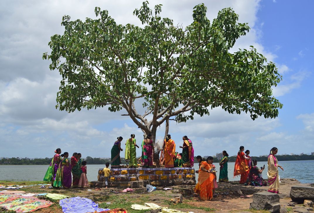 Pornima os full moon day and Wat is the name for the Banyan Tree. On the full moon day of the Hindu month Jyeshta month. On this day, married ladies worship the Banyan Tree and pray for the long life of their Husbands. Hence the day is celebrated as WATPORNIMA. A moment captured in my city with the lake in the background.