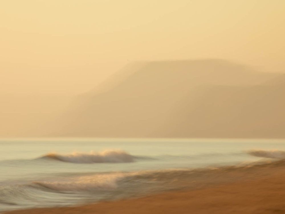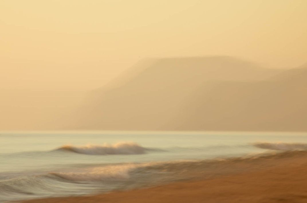 A single exposure, ICM (Intentional Camera Movement) image depicting incoming ocean waves in golden hour with the Coastal Cliffs at the background, taken at at Jurassic Coast, UK. A beautiful seascape in pastel colours, with a slow motion of the incoming waves.