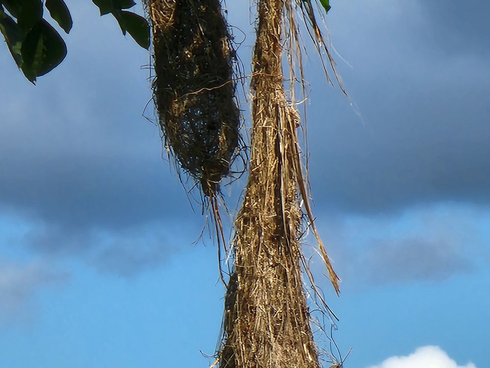A dozen Weaver Bird nests were hanging from a tall tree on the side of road going from Tena, Ecuador up into the Andes.