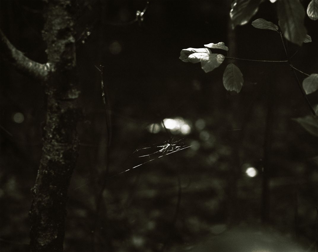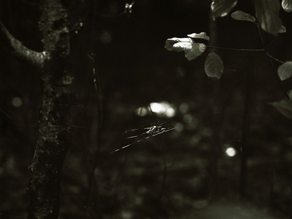 This is a photograph of a spiderweb I found connecting branches in woods near my house. Through dark, atmospheric photographs of the neglected, overgrown places where I grew up, I explore landscapes as unresolved as the memories they mirror. Twisted vines and forgotten paths reflect the shame and rage I’ve carried, the sense of being lost and searching for something I never truly knew. These images become a visual meditation on what is taken, what remains, and the quiet hauntings held in both bodies and place.
