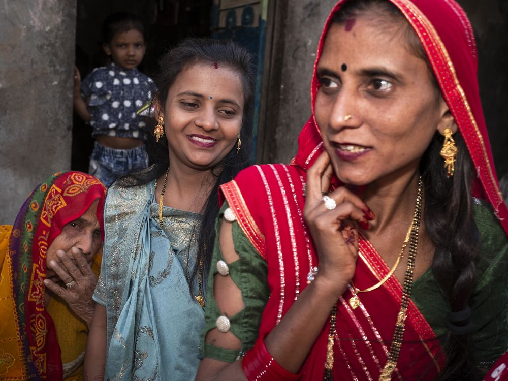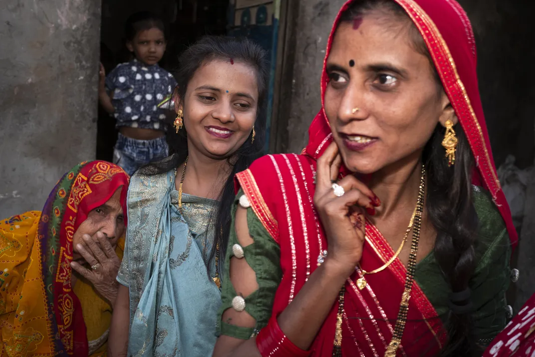 Dressed for the special occasion, these guests at a family wedding in a rural village in Gujarat reflect different emotions in reacting to the festivities.