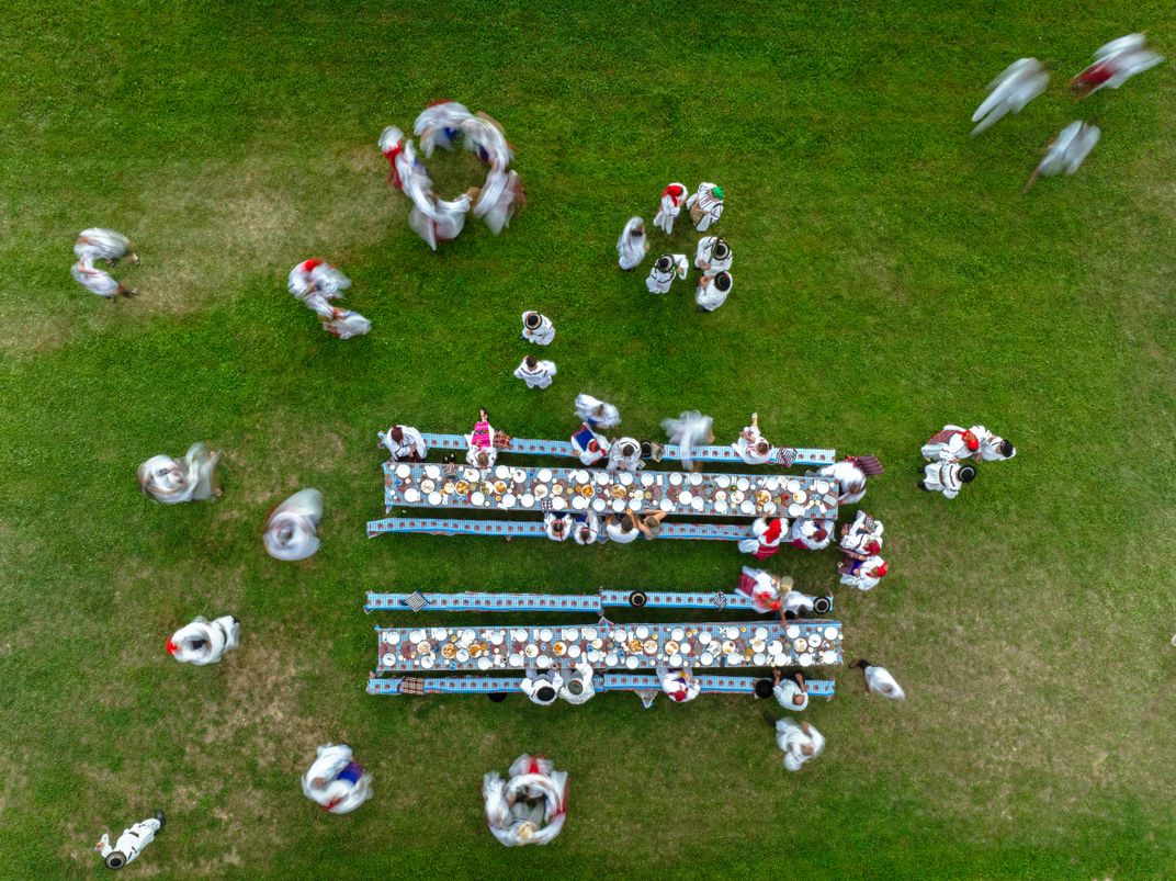 The image captures a traditional wedding celebration in Maramureș, Romania, seen from above. Long tables filled with food anchor the center of the frame, while guests dressed in traditional clothing move and dance around them. Their motion creates soft trails, revealing the energy, rhythm, and communal spirit of this rural festivity.
