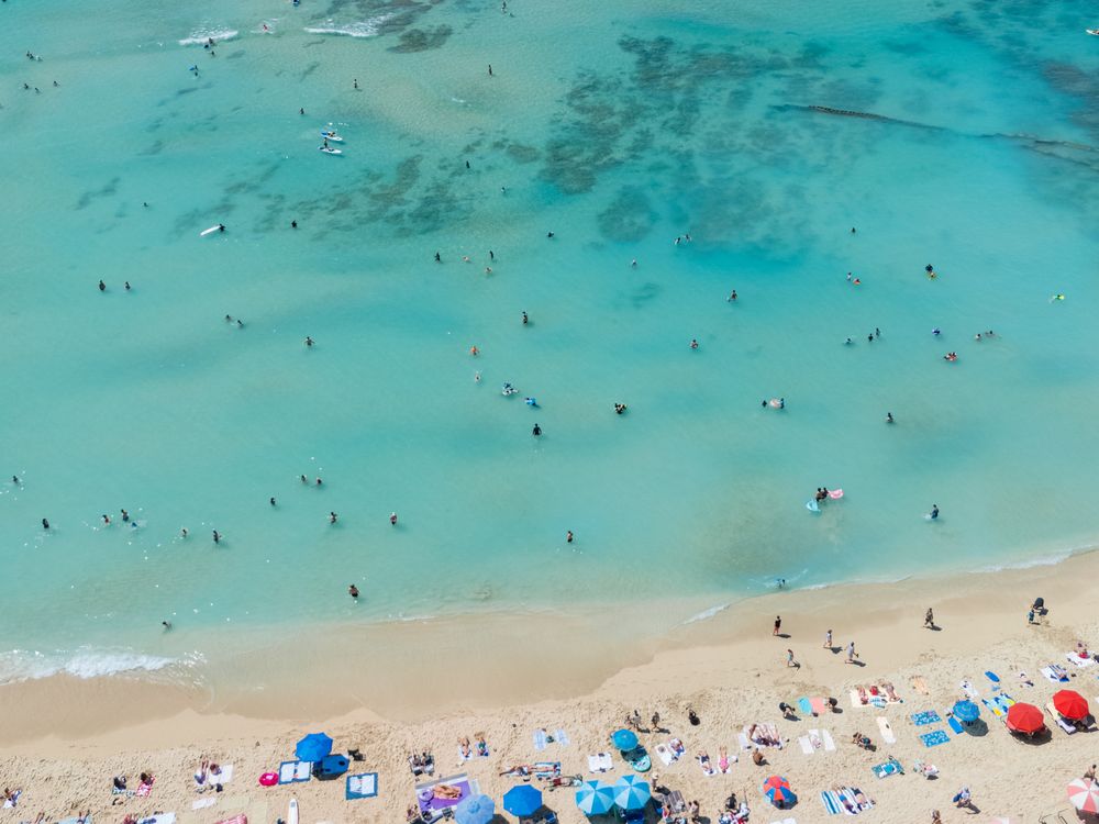 This is an aerial drone shot from above Waikiki Beach. Captured swimmers and surfers enjoying the day in the blue waters.