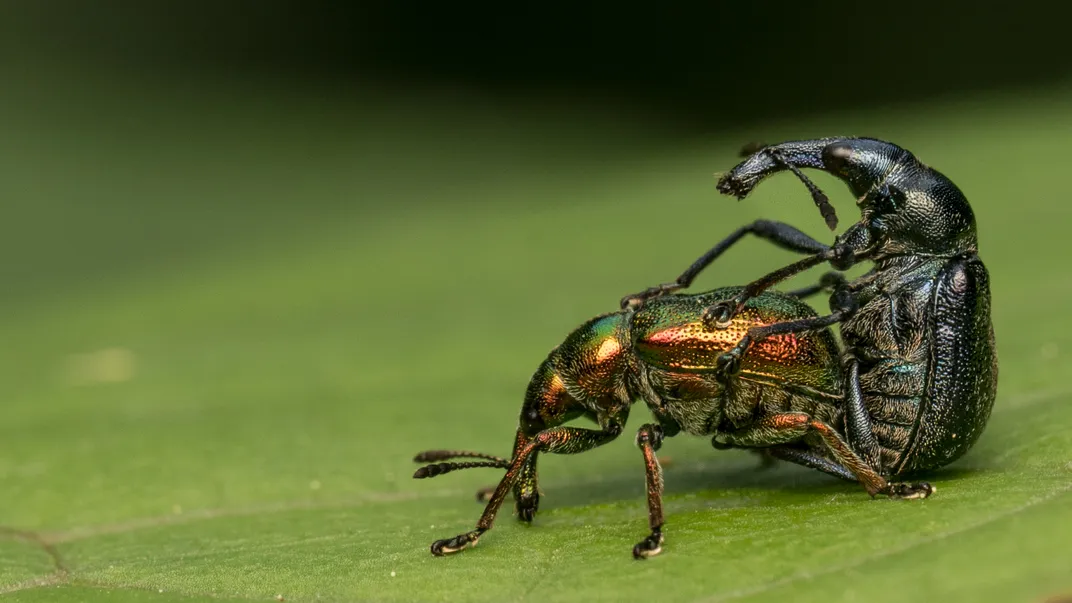 Pair of mating weevils (Byctiscus congener) on a leaf in a forest