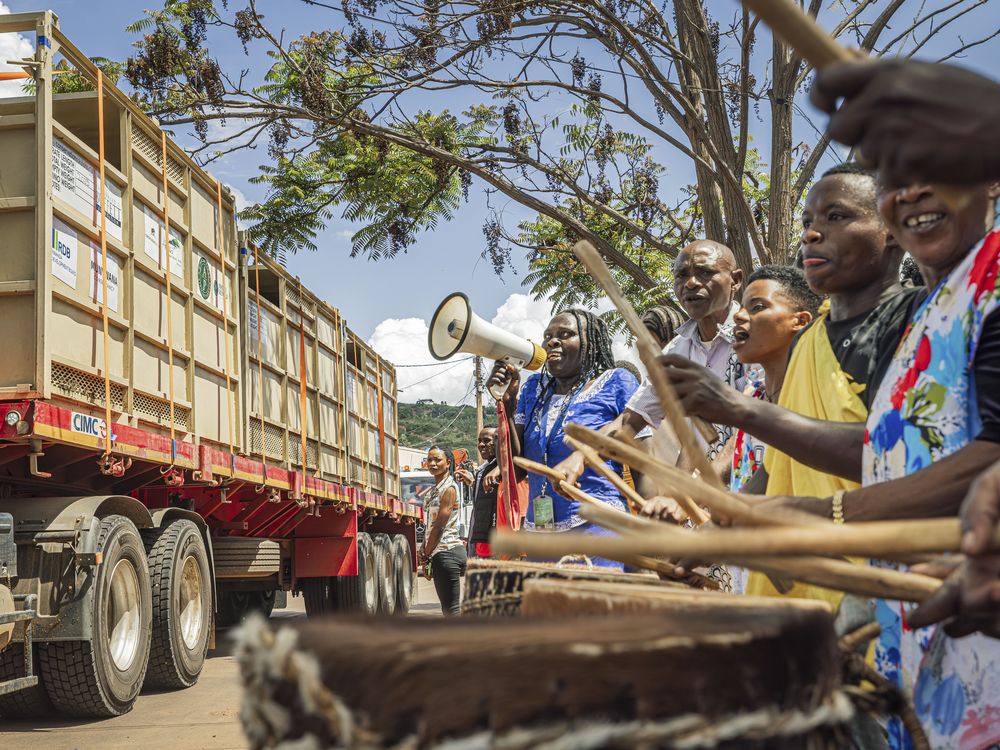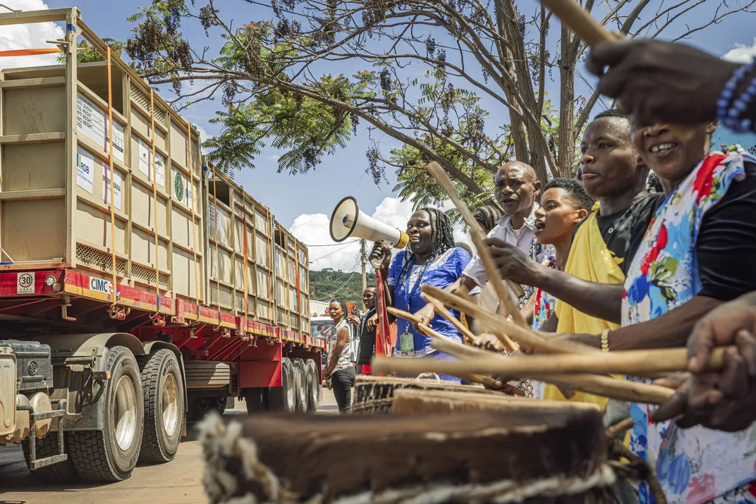 Crates carrying southern white rhinos pass through a Rwandan community to drums and cheers. As part of Rhino Rewild, 70 rhinos were moved from South Africa to Akagera, helping restore a park once emptied by poaching and now recovering under African Parks.