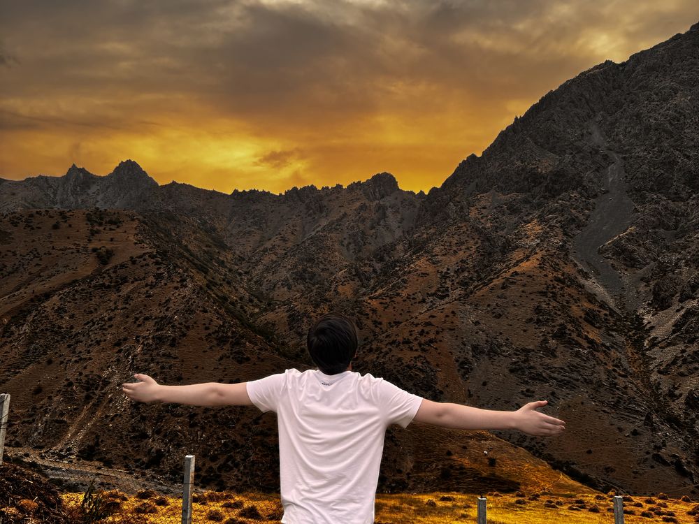 A traveler stands with open arms as the sun sinks behind the rugged mountain range, capturing the quiet power of nature at dusk.