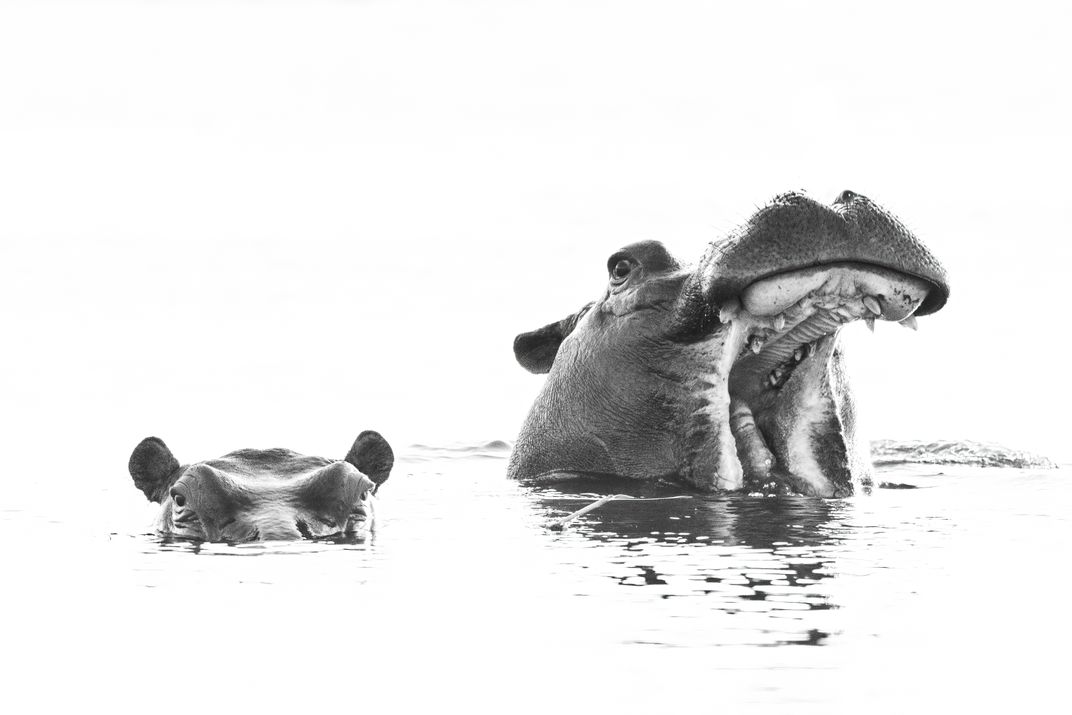 Two hippos on the Chobe River in Botswana engage in classic hippos behavior when confronted in their territory.