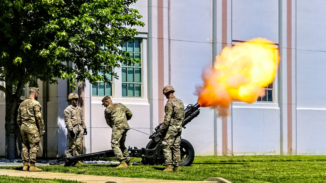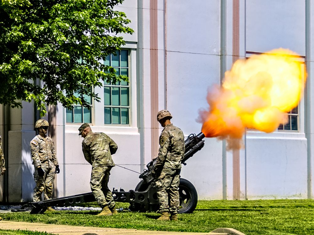 Members of the 130th Field Artillery Brigade of the Kansas National Guard signal they have returned home to Hiawatha, Kansas after annual training.