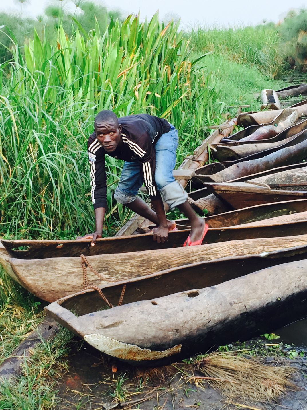The Ugandan Fisherman was exiting his fishing canoe after some time on the West Nile River.