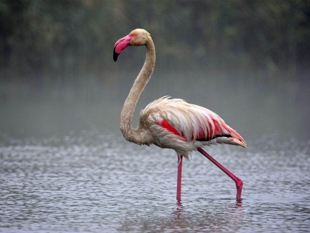 Foggy morning in AL Wathba, Abu Dhabi, beautiful flamingo walking through the lake. Amazing wildlife.