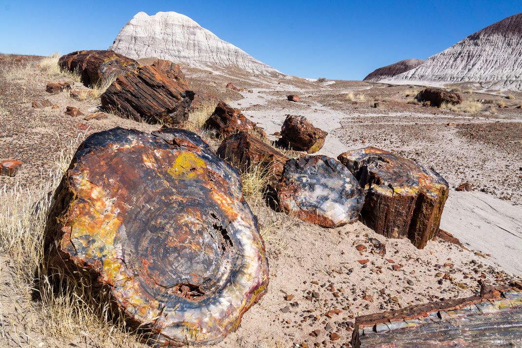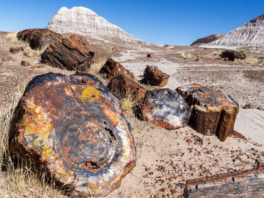Fallen logs, millions of years old, scatter colorfully across the semi-desert landscape at Petrified Forest National Park in Arizona.
