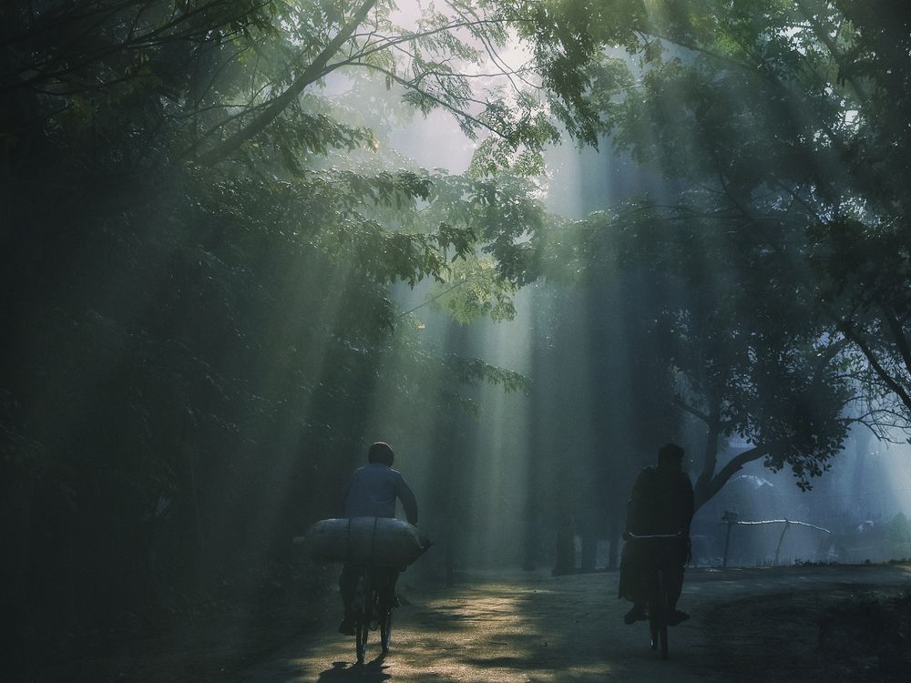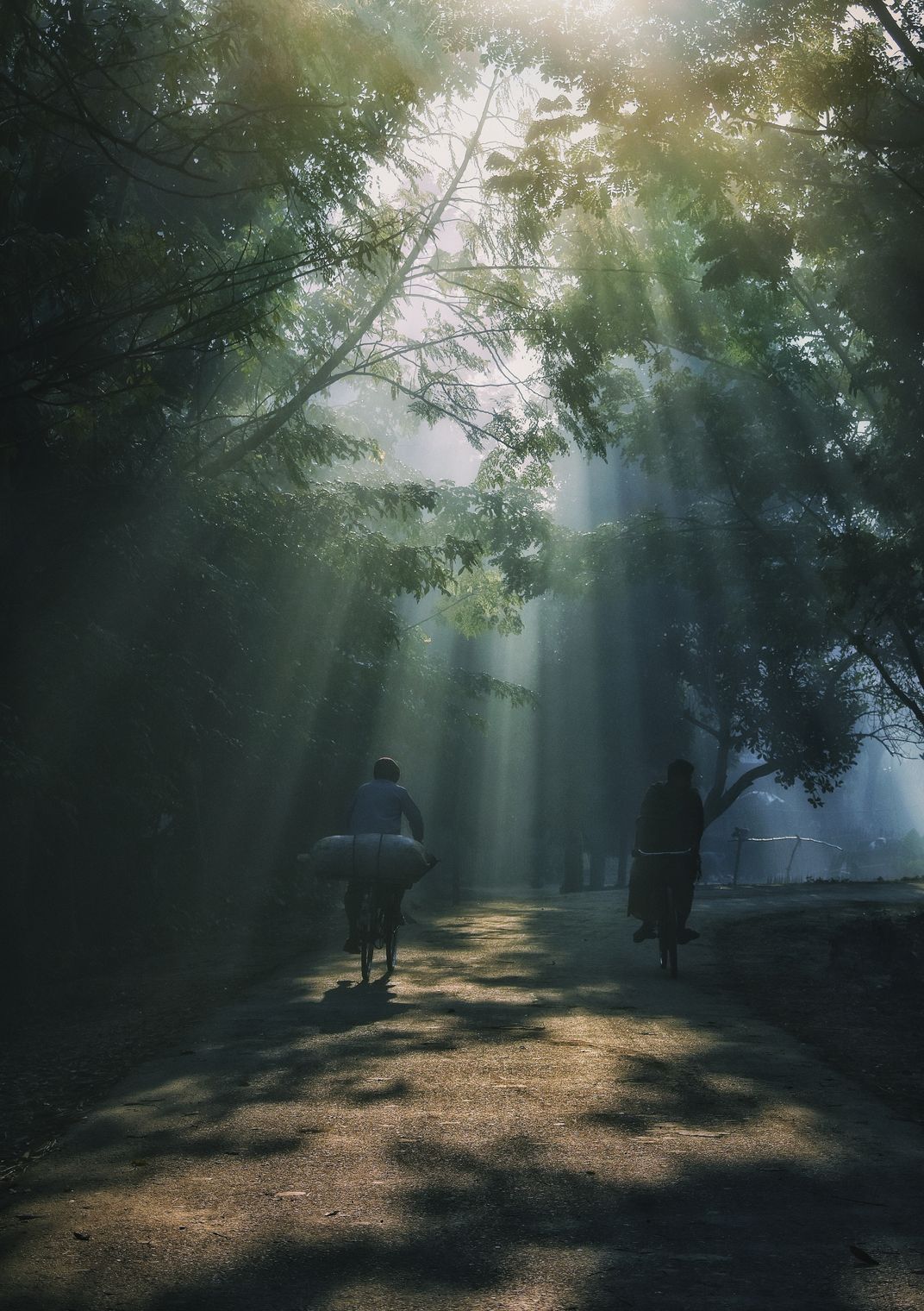 Soft morning rays filter through the dense canopy as two cyclists move quietly along the path. The mist holds the light like a curtain, turning an ordinary commute into something magical.