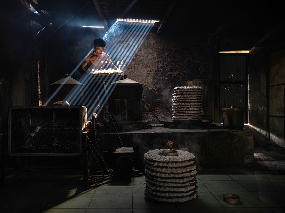 The image shows a worker in a small traditional pasta workshop, preparing the sheets of pasta as dramatic beams of sunlight cut through the roof