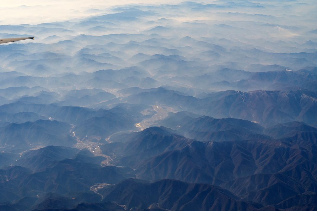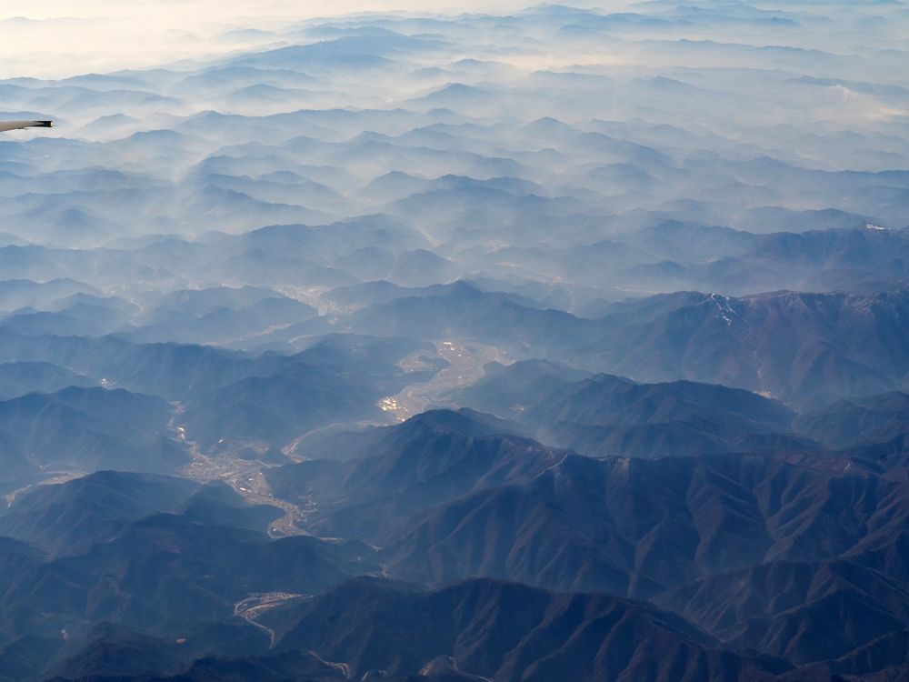 From high above Korea, endless mountain ridges fade into the haze like waves of an ancient sea. This quiet moment reveals the landscape as a living tapestry—each ridge a breath, each valley a whispered story written across the earth.