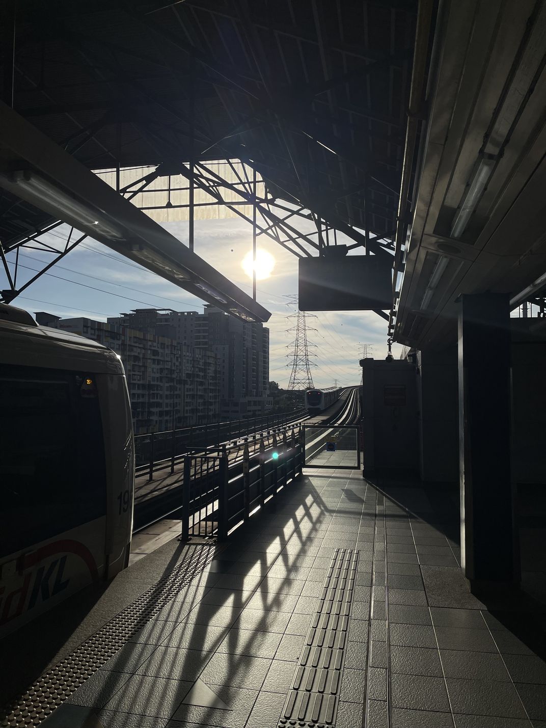 The golden hour captures a moment of transit on an elevated platform, where the sun silhouettes the urban landscape and casts long, dramatic shadows. This train station is a daily convergence point, a silent stage for countless stories of people arriving, departing, and moving on with their lives.