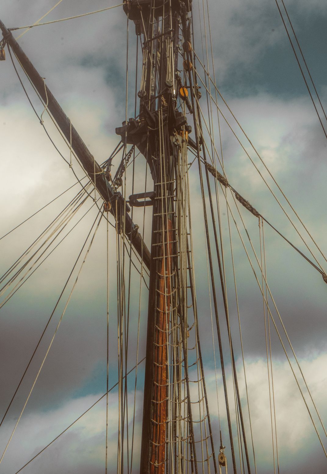 The Pride of Baltimore II is a permeant fixture in Old Town on the Potomac river. This is the mast of the ship, during the windy fall when the sails are not at full mast. The original ship was built in 1817 but this is a rebuilt version.