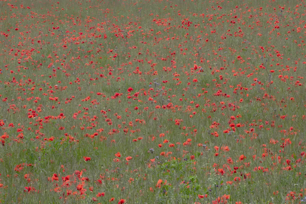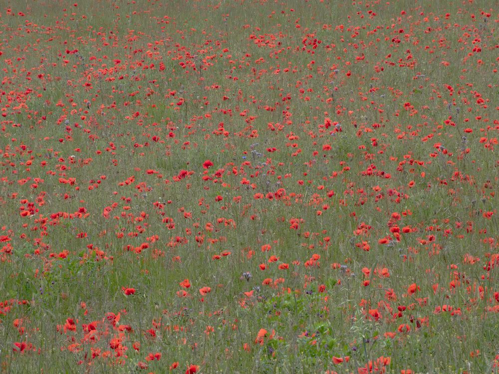 A field of red poppies in spring with a lone daisy amongst them.