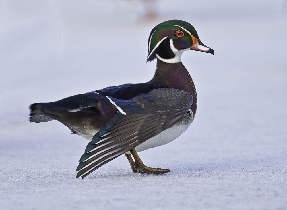 While photographing wood ducks in Ontario Canada in winter I was very lucky to capture this Wood duck drake displaying his beautiful colours. What gives this image to me pop is he is high keyed in the snow that really brings out his colours.