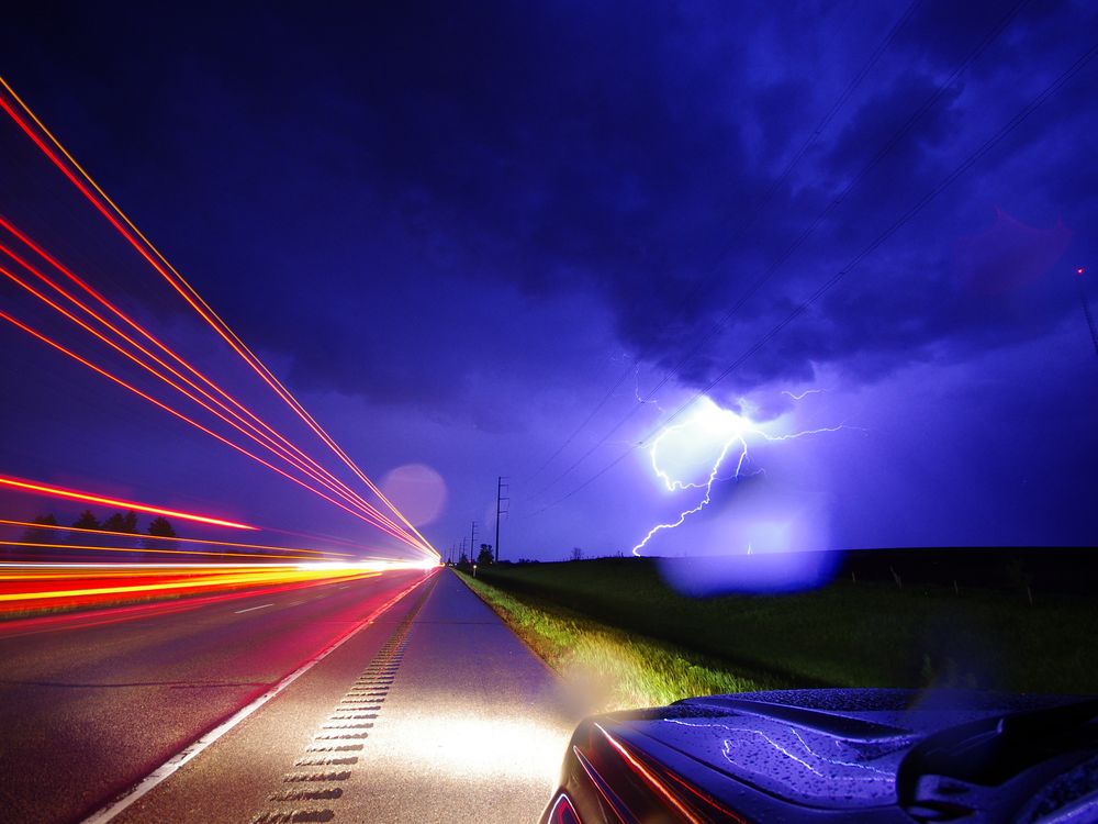 While returning back from a road trip, a heavy lightning storm came closing in. While stopping to photography the storm on the side of the road a truck drove by illuminating the road.