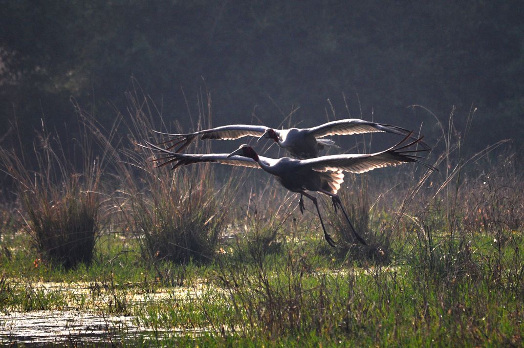 While walking in the morning,saw a lovely pair of Saras Crane flying and coming towards me in a single file loocking like TITANIC pair one above the other.