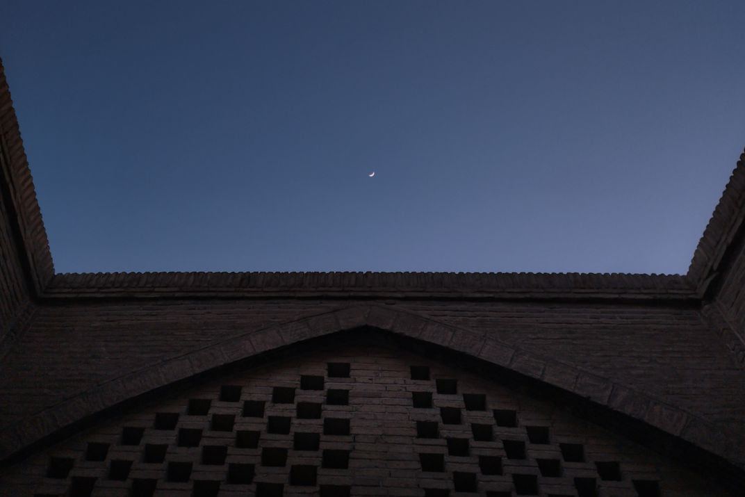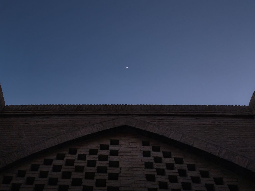 As the day fades into twilight, a crescent moon rises above the ancient walls of the Jame' Mosque of Isfahan. The silence of the courtyard and the soft blue of the evening sky evoke a timeless serenity — a quiet dialogue between earth and sky, faith and stillness.