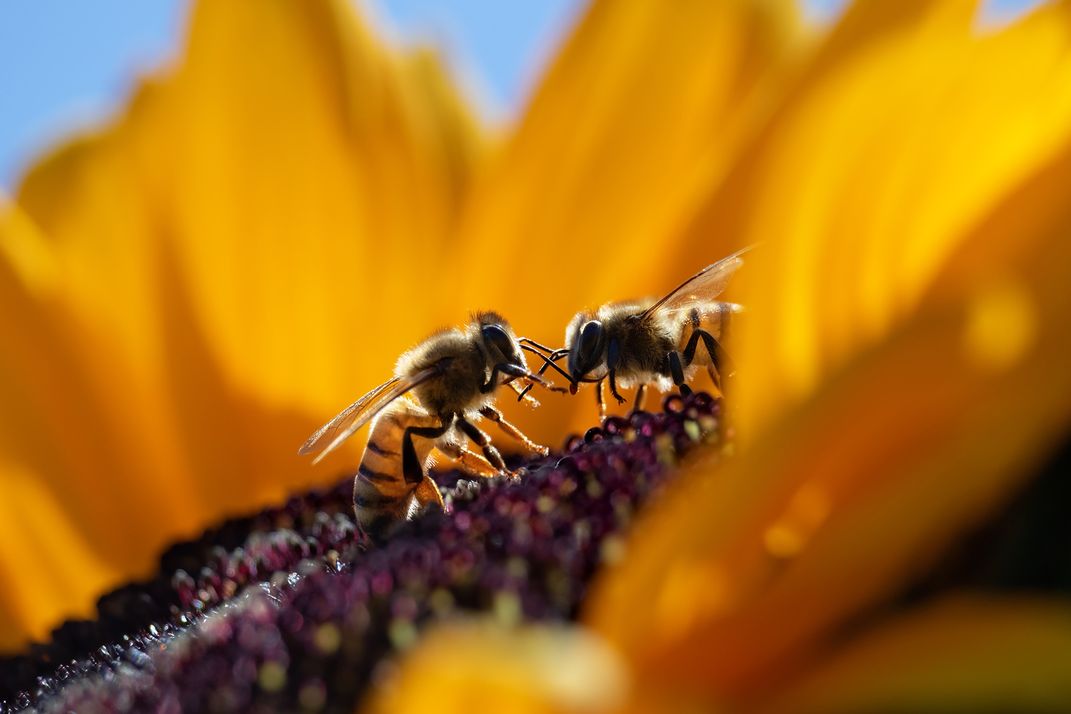 Two bees whispering to each other on a sunflower. I am seeing their delicate and beautiful world that we usually do not notice.