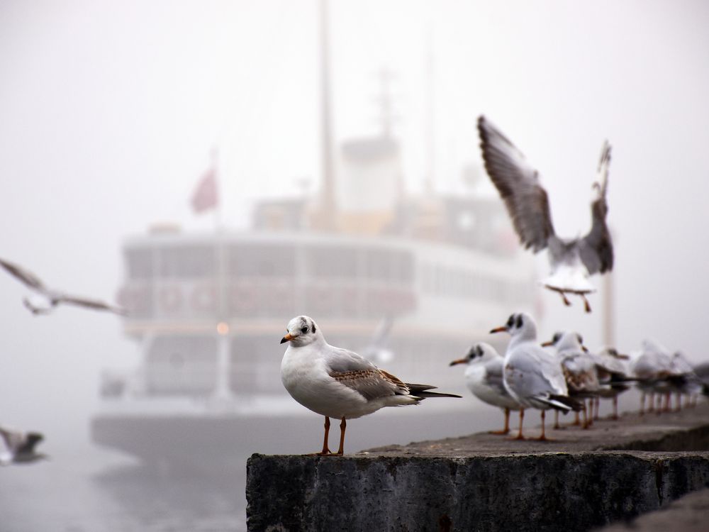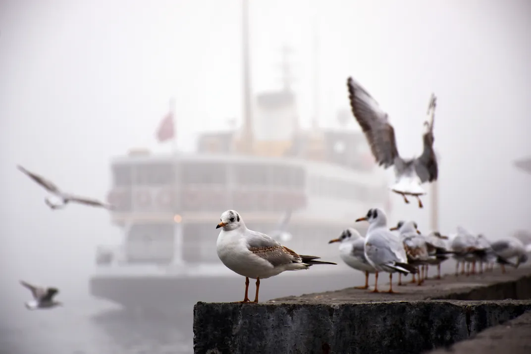 Seagulls, a symbol of Istanbul, take a moment to rest by the mist-covered shore against the breeze.