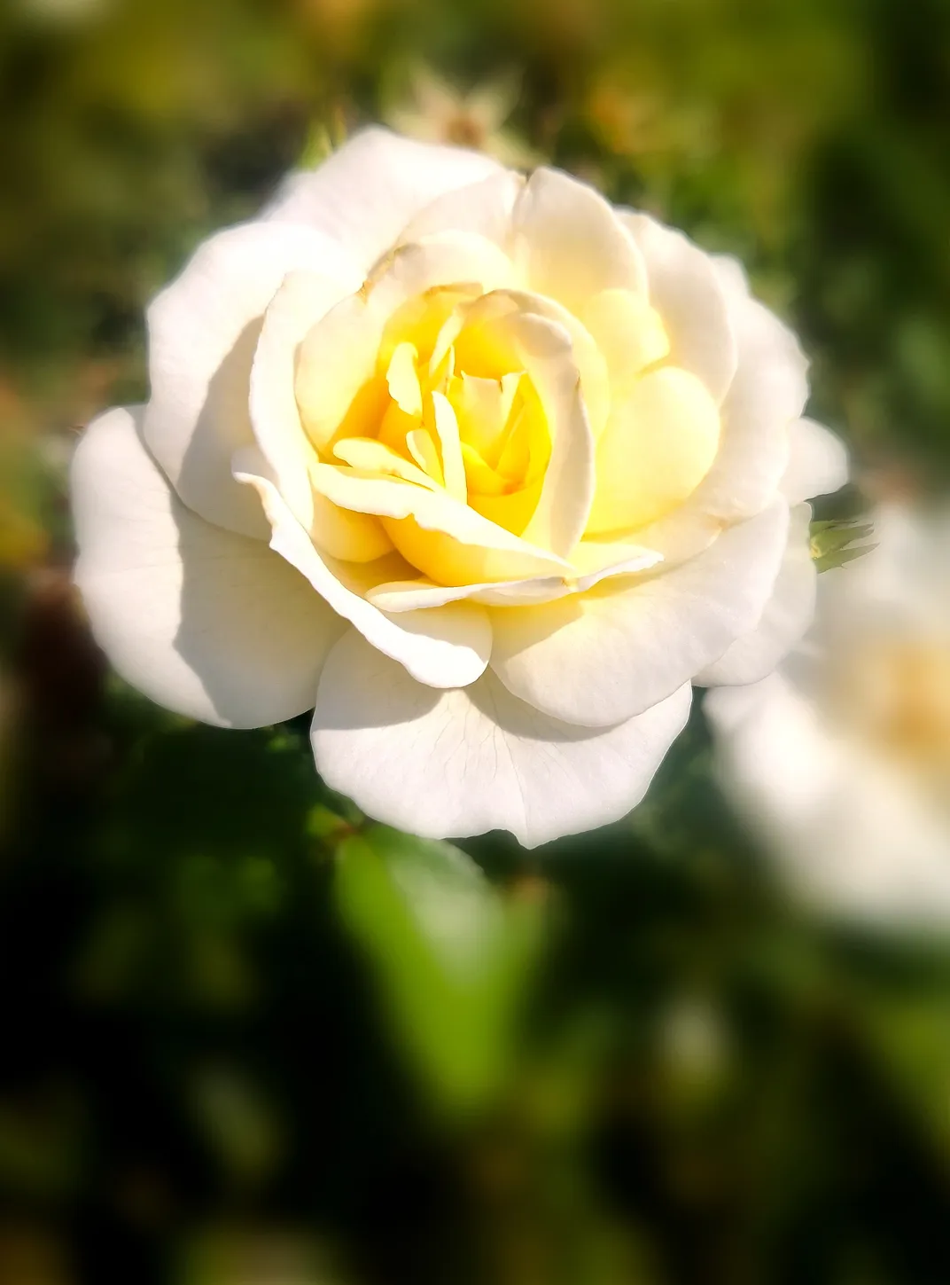 A blooming rose glowing with soft yellow and white petals, symbolizing purity and quiet strength.