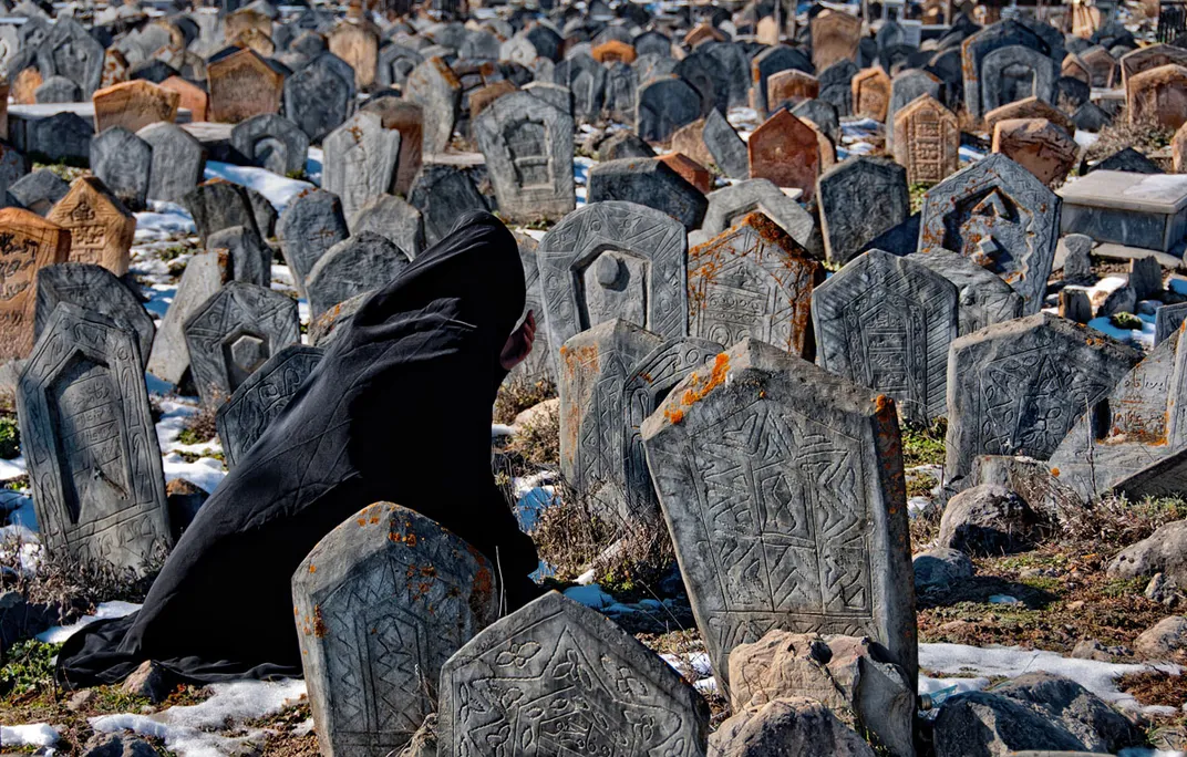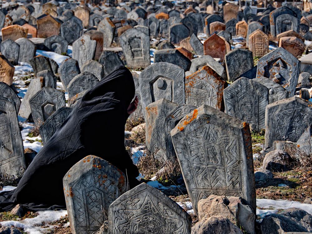 During my travels in northern Iran, I visited a botanical cemetery where nature and memory intertwine. Among the tombstones, a woman walking quietly caught my attention. With her black chador, she seemed to have risen from one of the graves herself, moving slowly as if tracing the lives and stories of those laid to rest.