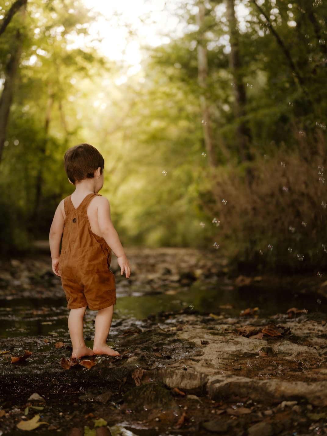 A little explorer wades through the creek, barefoot and carefree, surrounded by the beauty of nature. Childhood wonder captured in a quiet moment of discovery, where the forest and water become his playground.