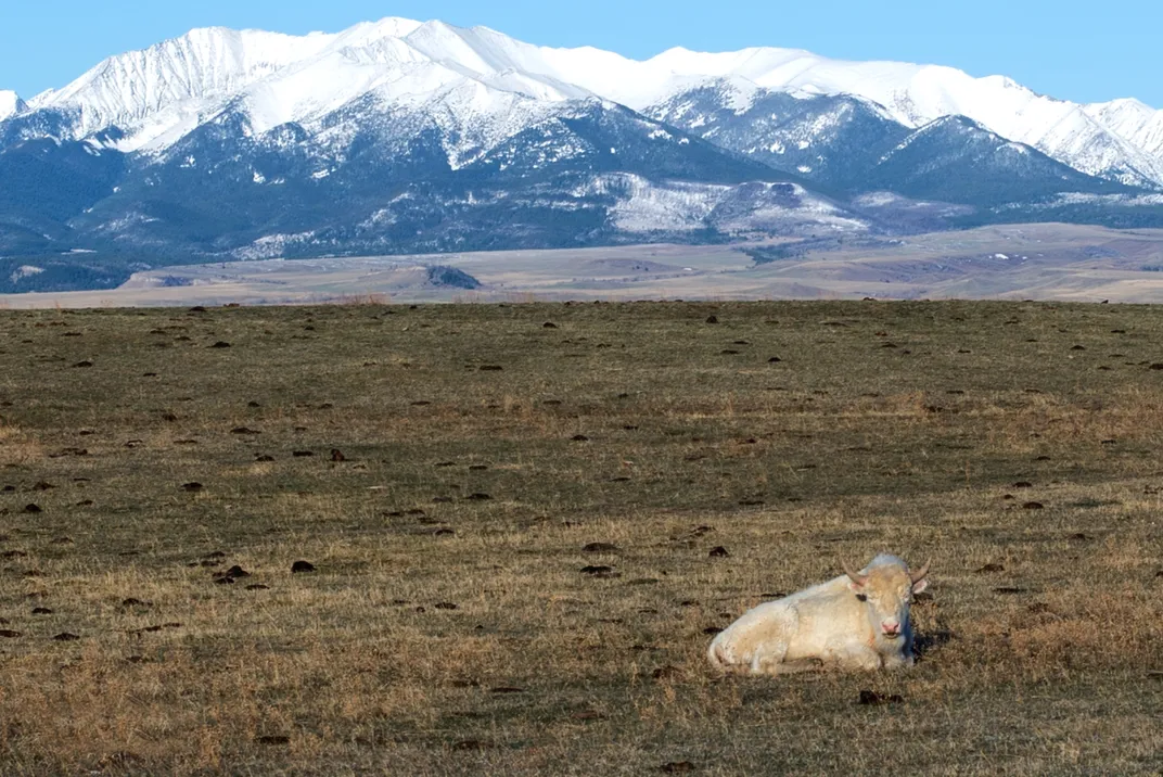 A white buffalo resting east of the Crazy Mountains near Big Timber, Montana. In certain western American Indian tribes, white buffaloes hold special spiritual meaning. White buffaloes (albinos) are rare.