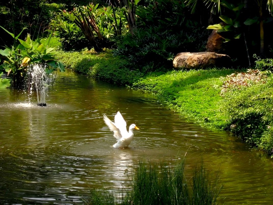 White duck bathing in the pond