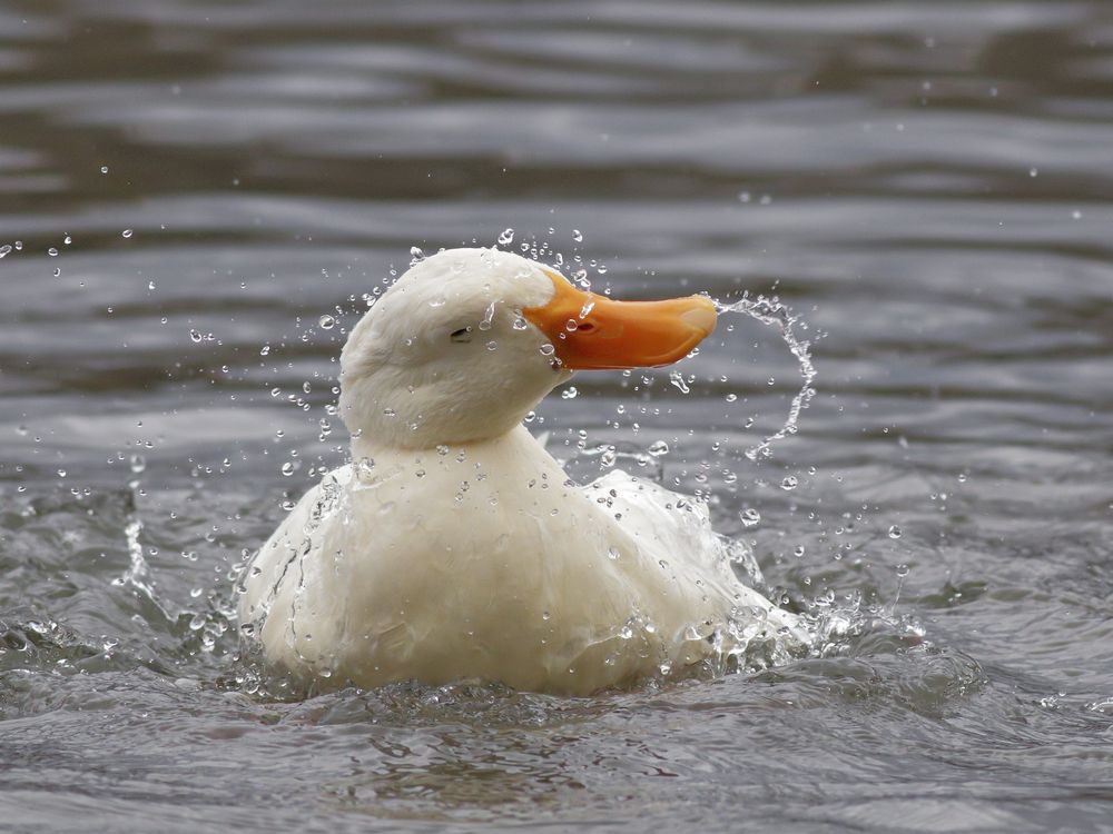 A white domestic duck shakes water off of it's head as it bathes in Webster's Pond near Syracuse, NY.