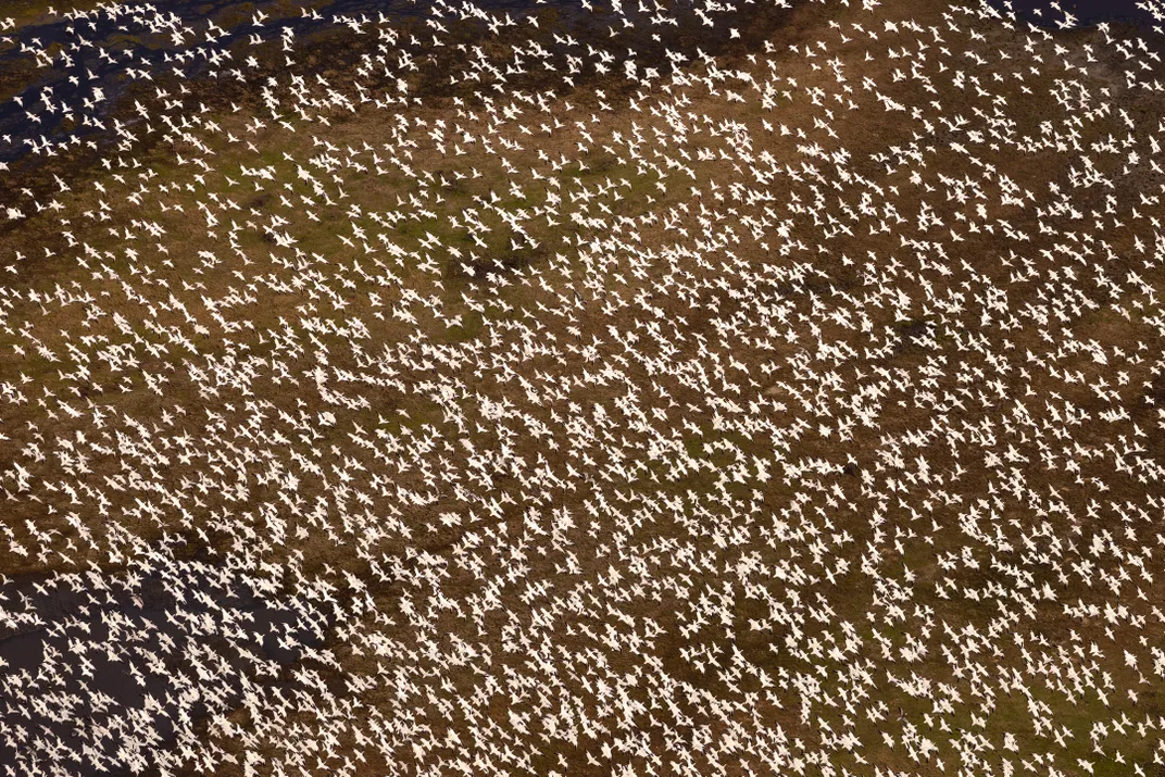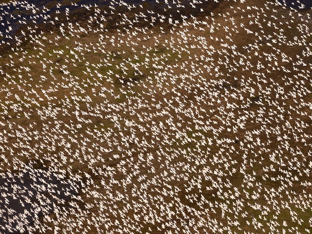 A dense flock of white snow geese lifts off in unison from a wetland, scattering across the landscape in thousands of drifting shapes. Seen from above, their coordinated movement dissolves into abstraction — a living pattern that fills the frame and overwhelms any sense of scale.