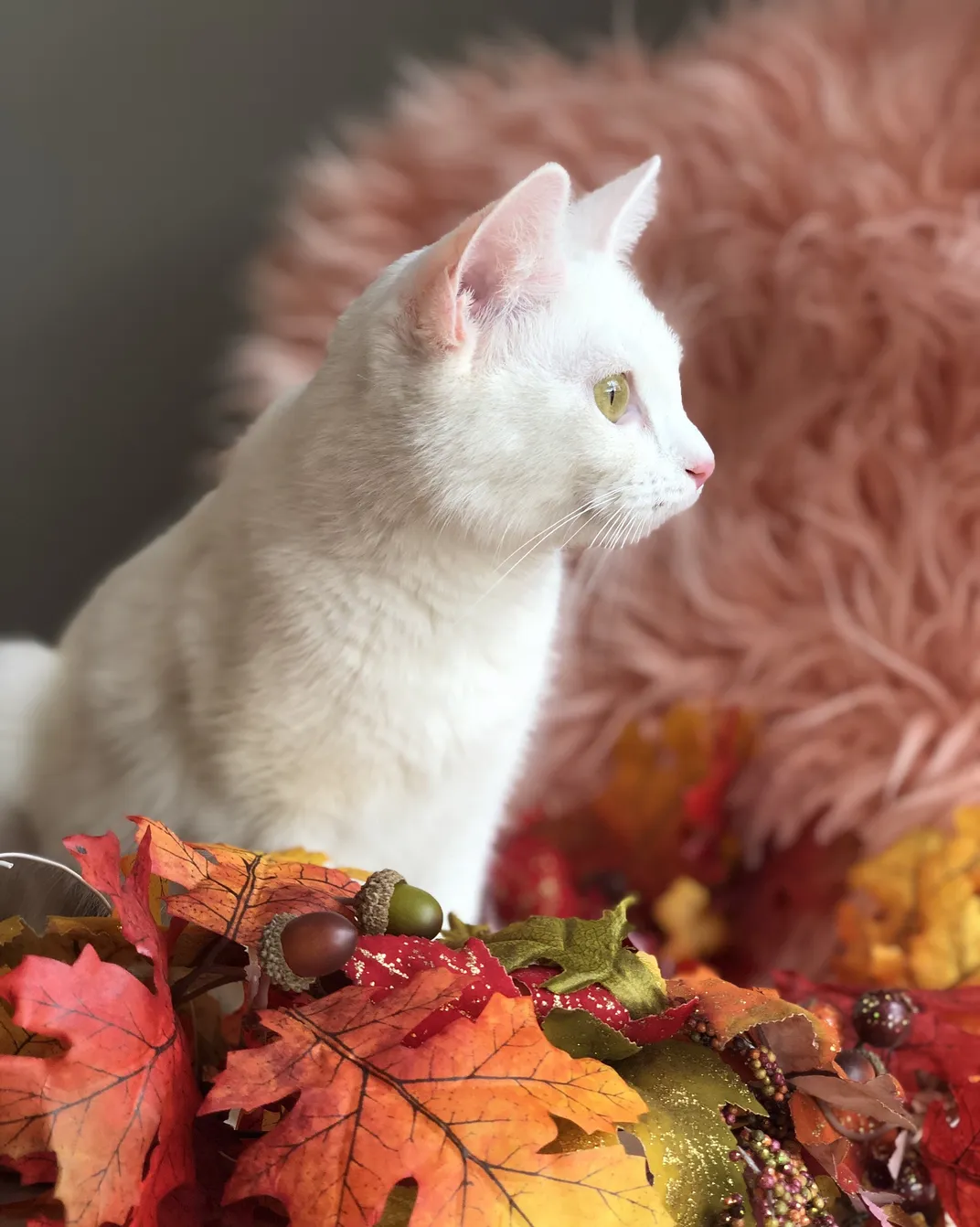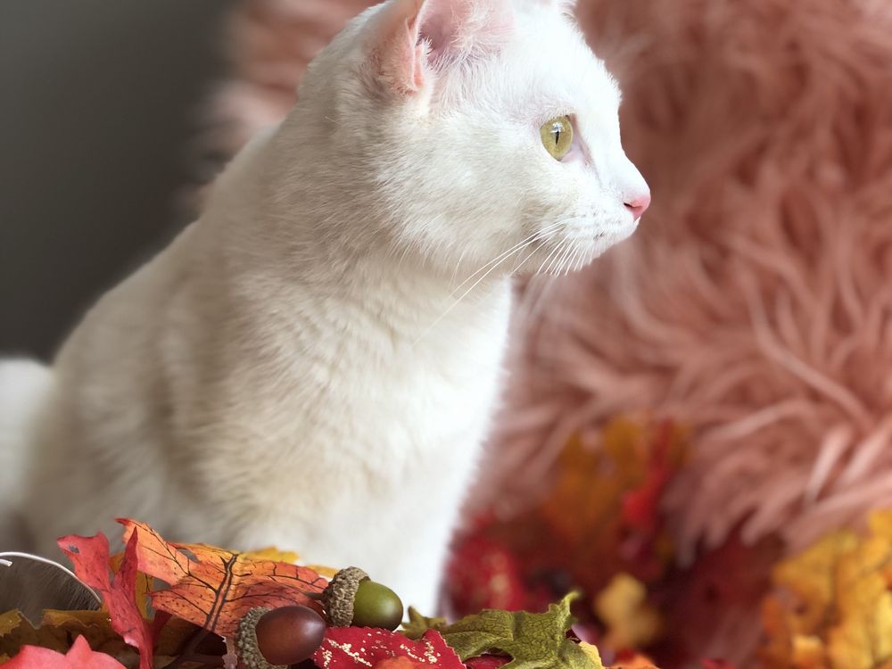 White rescue cat posing.