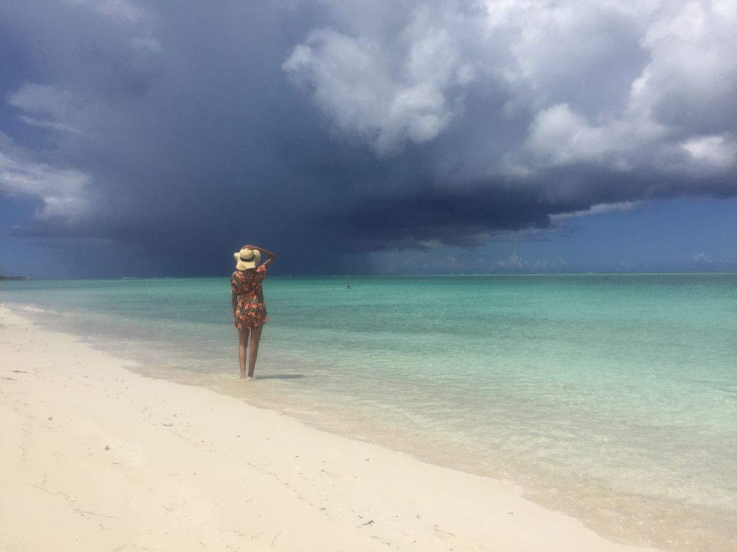 My wife, during our honeymoon in the Turks and Caicos Islands, was looking out over the horizon at the approaching dark clouds. The shot framed her perfectly against the white sand, clear water, and a dark patch of sky. Incidentally, this was one of the smaller islands that also happened to have the distinction of being one of the few landmasses within the Bermuda Triangle.