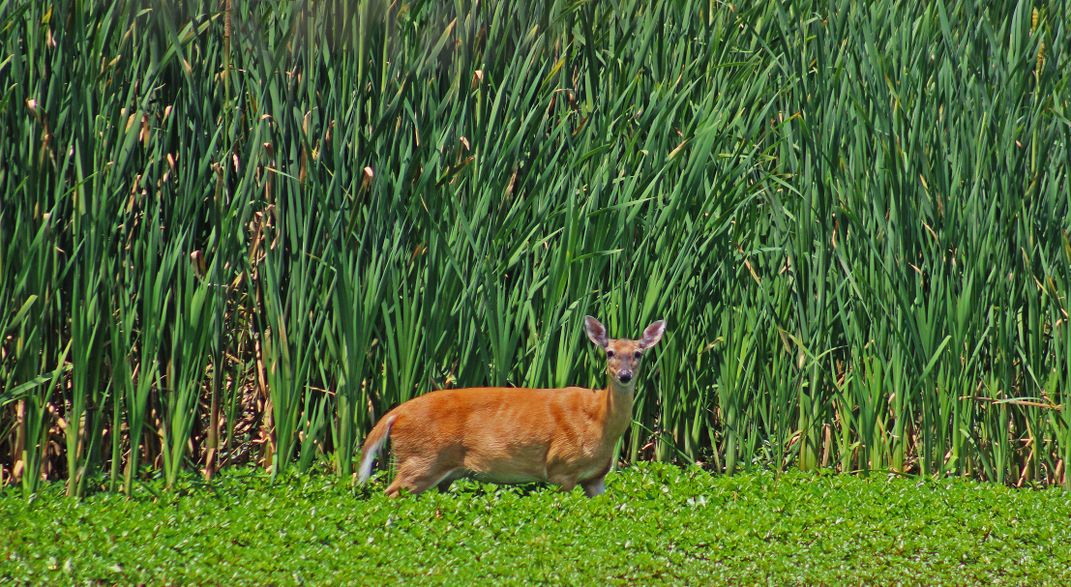 A white tailed deer strolls through the lake taking bites from the lush, spring vegetation while keeping a very close eye on me.