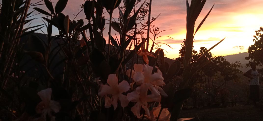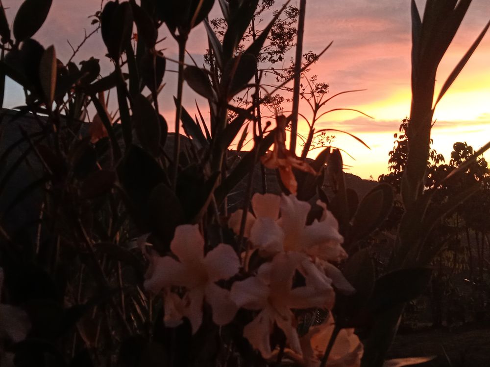 This white Vireya rhododendron is my favourite plant and as sun was setting today, I took this photo from our walkway down meeting the driveway. It's looking orange from the sun's effect but it is actually white and so beautiful. When my husband and I came to live in my village back in 2012, my husband and I went for walks collecting the plant in our bushes and bringing them to our home to plant. They grow in abundance here in our village but naturally in the wild. Only at our house will you find them growing and blessing us with their beautiful flowers that every one in our village keep admiring.