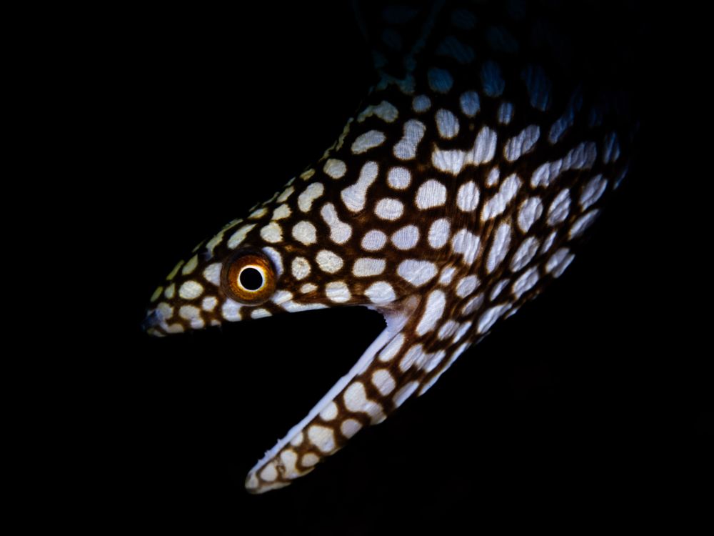 A Whitemouth Moray peeks from the reef, its white mouth and patterned body framed by the coral.