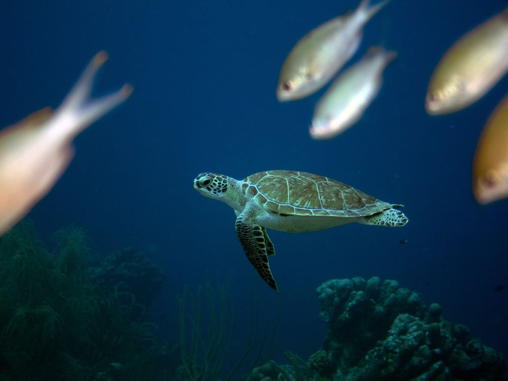Sea Turtle swimming along at the 1000 Steps dive site in Bonaire. There was a school of brown chromis on the reef, and they appear to be framing and highlighting the turtle.