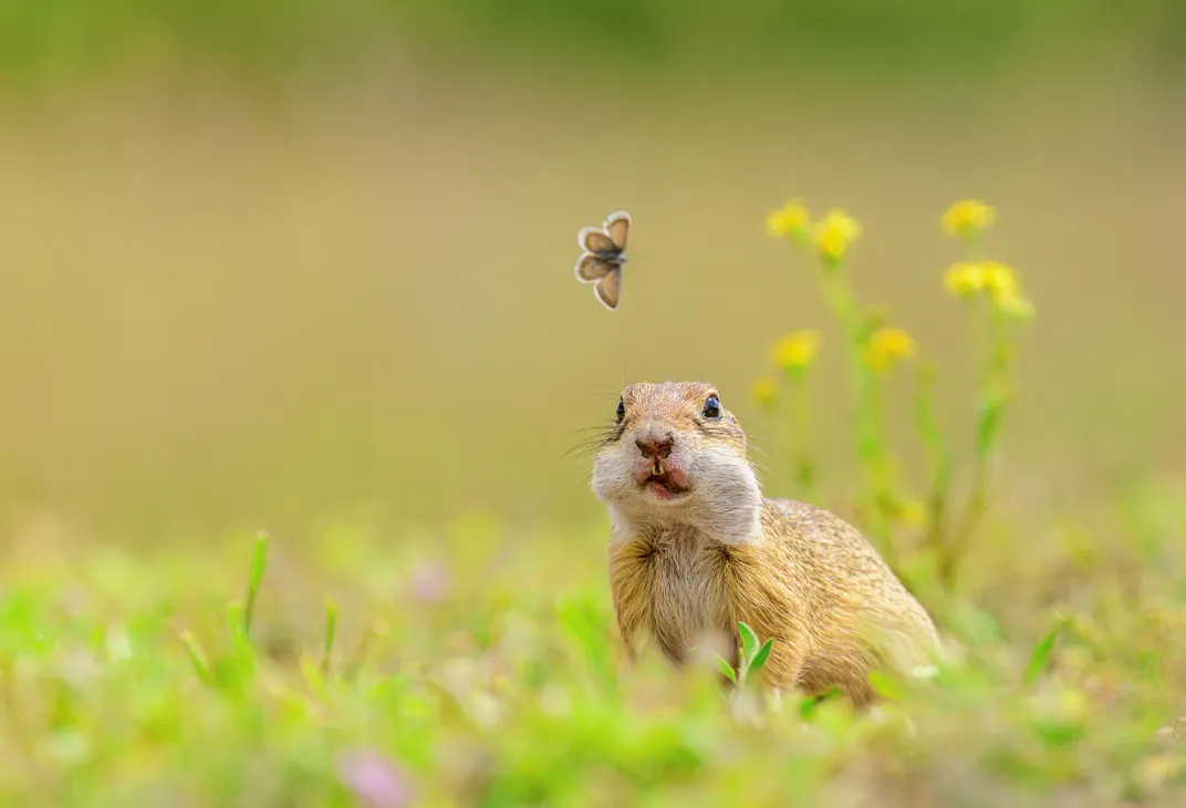 A ground squirrel and a butterfly captured together on a flower-covered meadow , a playful and unrepeatable moment in nature.