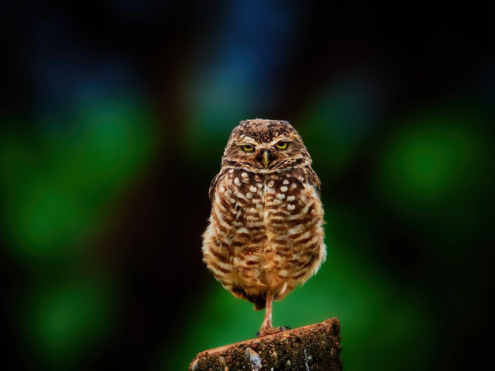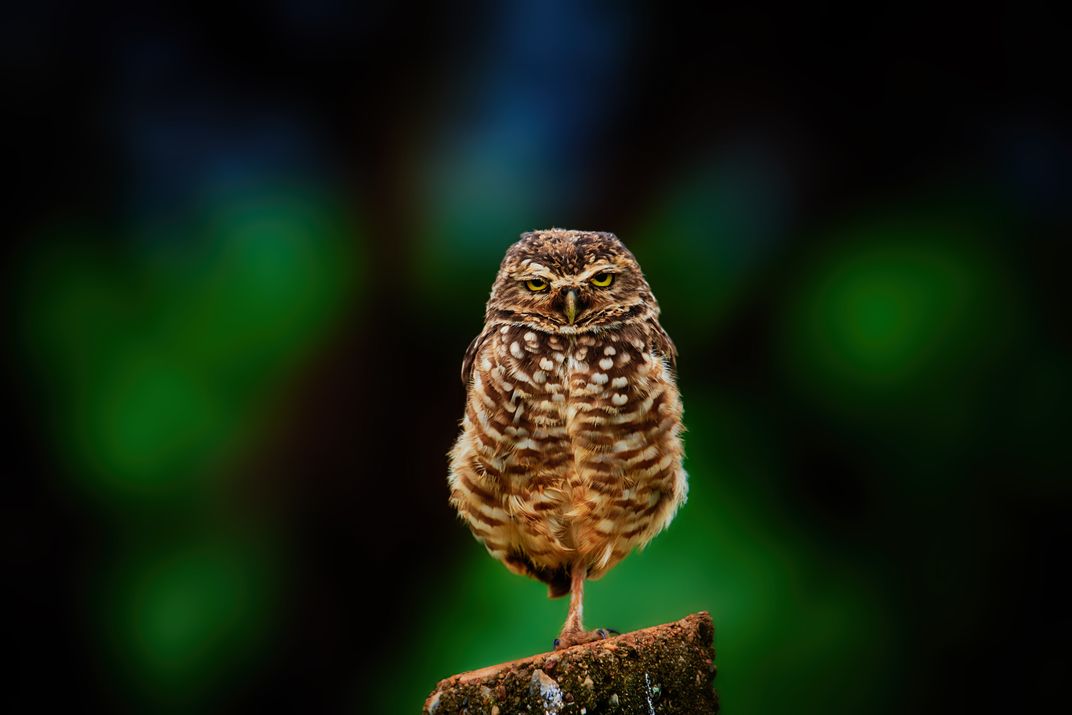 This is a burrowing owl standing on a fence post. As I sometimes do on early walks on weekends, I was carrying my camera. This owl was standing looking very serious and had a nice background behind him, so I took a couple of pictures.