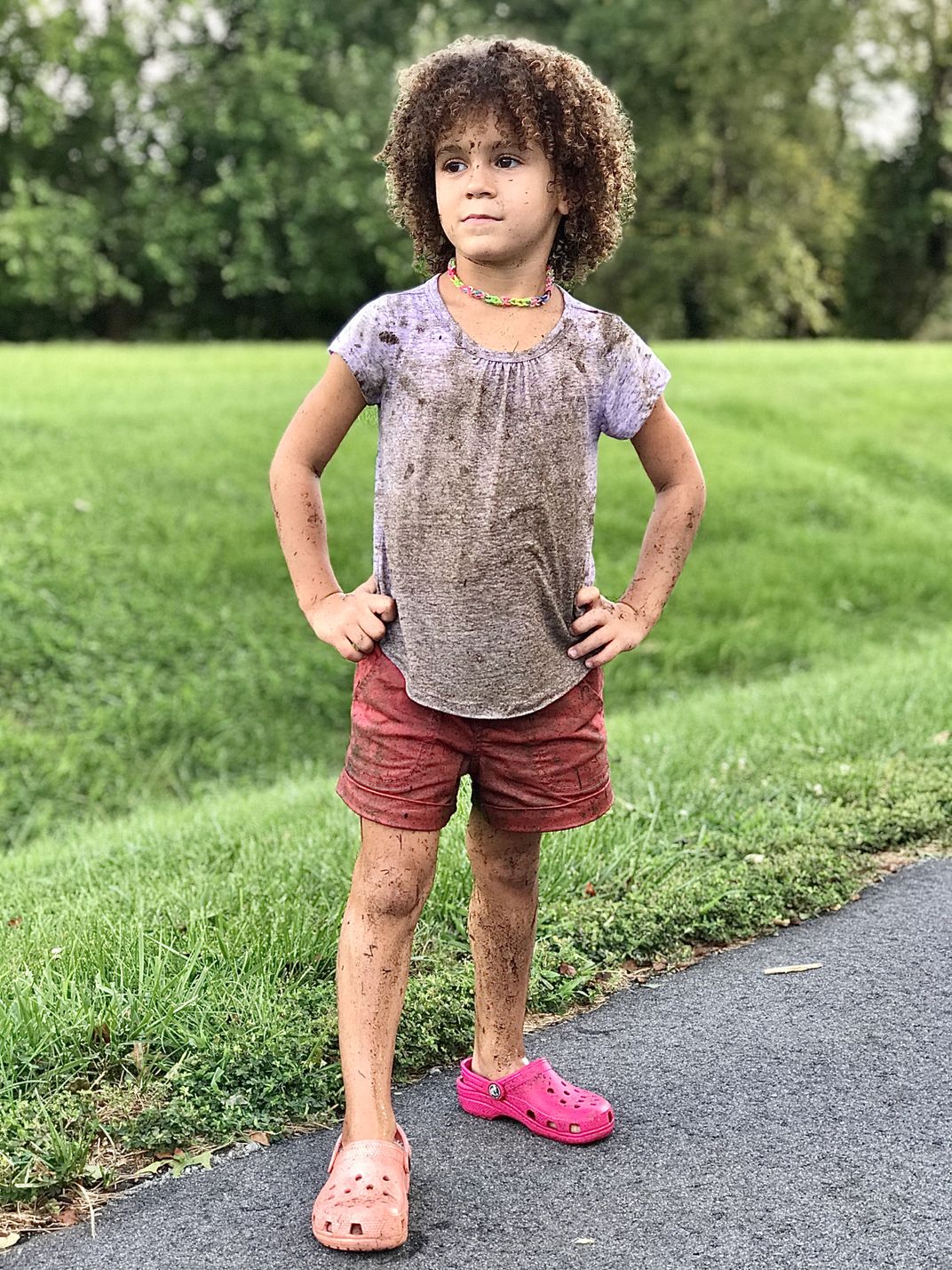 Five-year-old girl feels on top of the world after a muddy puddle adventure.