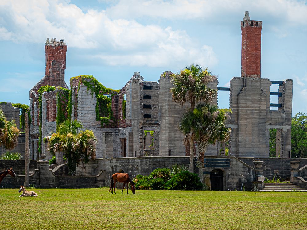 Wild horses graze freely among the historic Carnegie estate ruins on Cumberland Island, Georgia. The scene captures the island’s untouched beauty and the unique blend of nature and history that defines this remote coastal landscape.