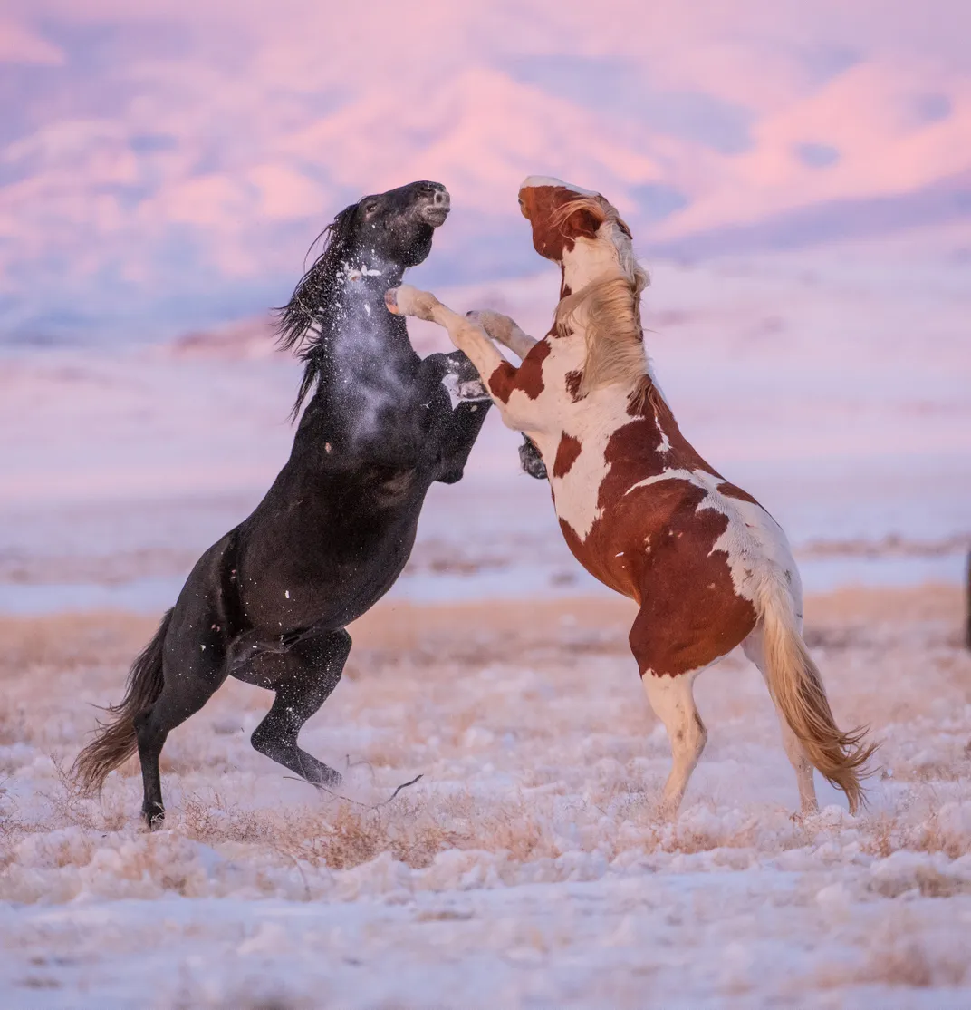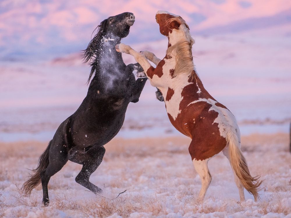 A pink sunset reflects from the Utah mountains as two wild stallions duel.