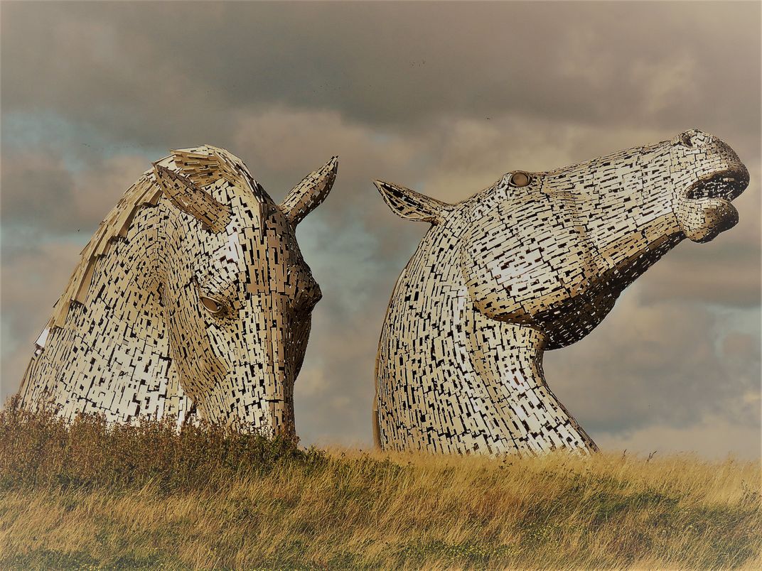 Looming over a hill the Kelpies appeared to be charging over the landscape