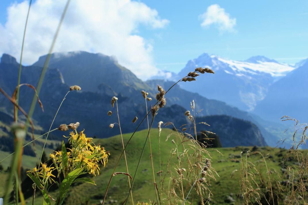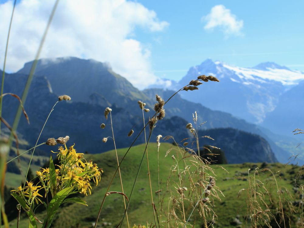 Wildflowers against the backdrop of Schynge Platte Swiss mountains